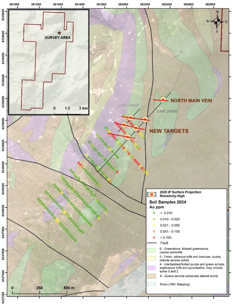 “We are pleased that IP appears to be a viable exploration tool to explore this target rich project. Known gold veins at the Windy showing were detected as resistivity features and a significant series of new resistivity targets have been revealed corresponding with strongly anomalous gold values in soil from the 2024 exploration campaign. We are excited to expand this survey over other targets on the Property in preparation for diamond drilling in summer 2026,” states Gary Schellenberg, CEO and Director.
