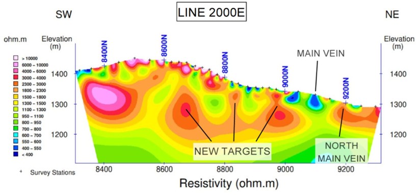 - Two Au-bearing veins show distinct responses. North Main Vein corresponds to a resistivity high while the Main Vein corresponds to a distinct resistivity low with high chargeability.