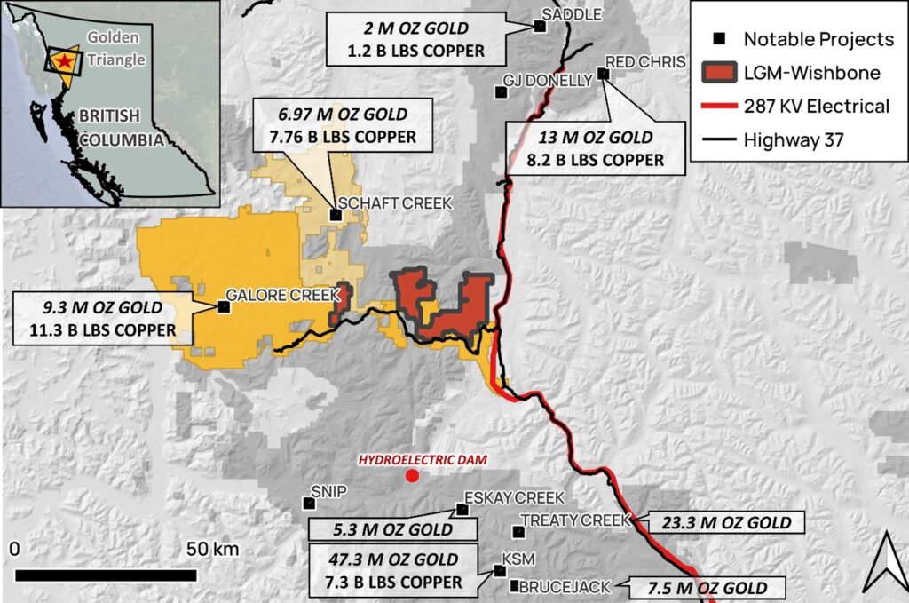 Map 1 showing the Origen’s LGM and Wishbone properties located in the central area of the British Columbia’s world-famous Golden Triangle estimated to host 249 million ounces of gold and 93 billion pounds of copper (DiGeoData estimate – 2021)
