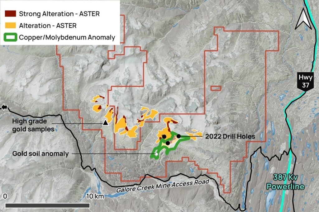 - Scout drilling of 5 holes in 2022 noted distinct megacrystic pophryrytic and pseudoleucite, characteristic of one of the main mineralizing phases at Galore Creek