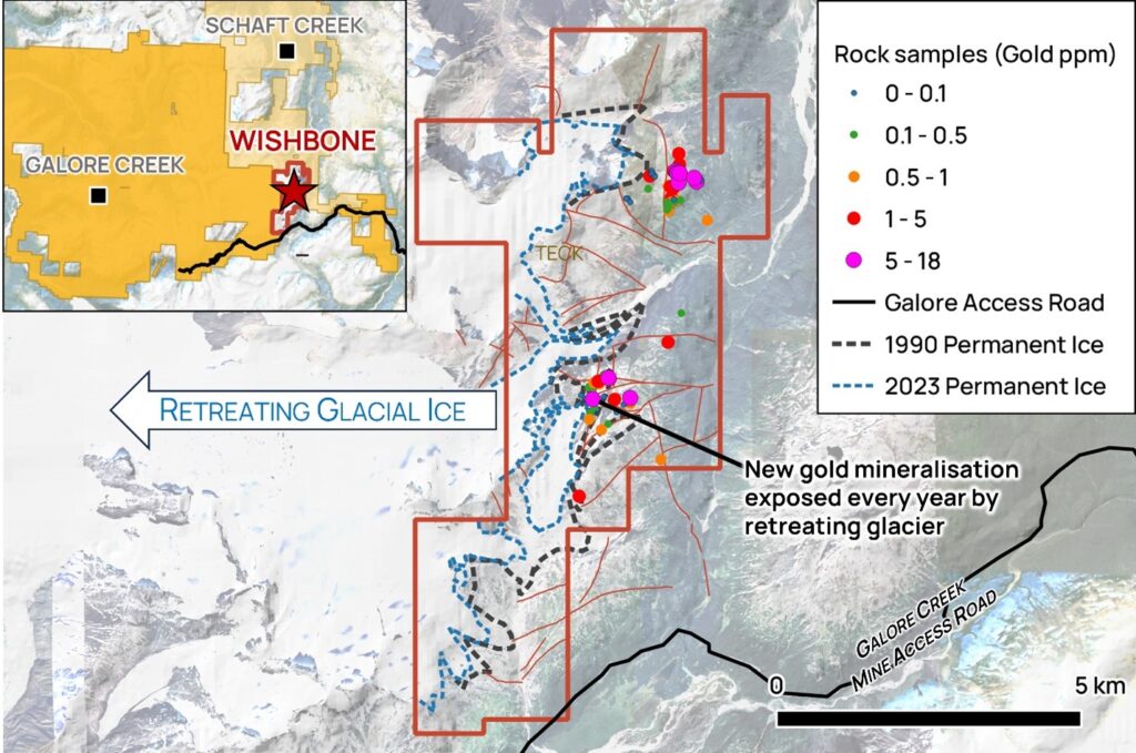 - Rapidly receding glacial ice has exposed new high grade gold showings.