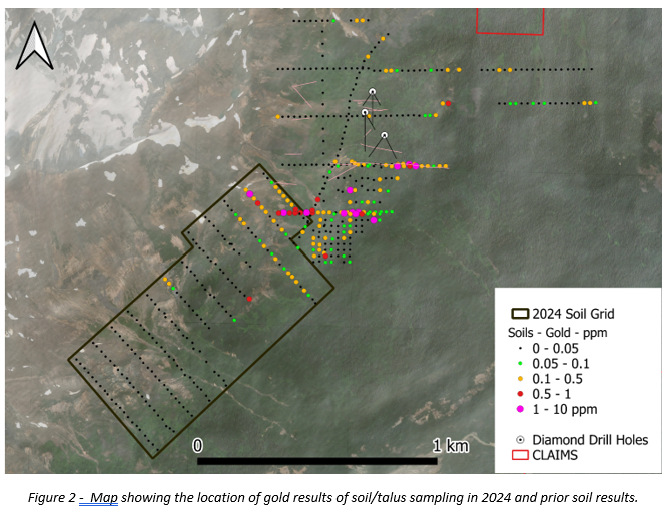 209 soil and talus samples were collected south of the Windy target area and a remarkably broad, anomalous gold in soil/talus anomaly was outlined and now extends greater than 1.5 kilometres over the eastward facing slope of the valley. Samples returned <0.05 to 1.18 ppm gold with the highest sample results being close to where previous samples had returned in excess of several ppm gold in soil/talus fines. This area is high priority for further exploration to zero in on the source of the gold anomaly.
