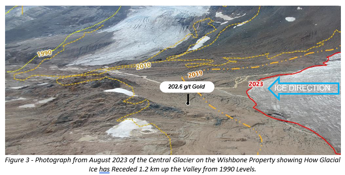 “Given the remarkable grades of gold that have been exposed by recent years of ice melt on the south and eastern flanks of the Central Glacier, we are confident that we are close to the bedrock source of these high-grade rock samples. 2025 is poised to be an exciting field season at Wishbone with these new results painting a picture of a very prospective corridor that deserves a robust field program next season,” states Gary Schellenberg, CEO.