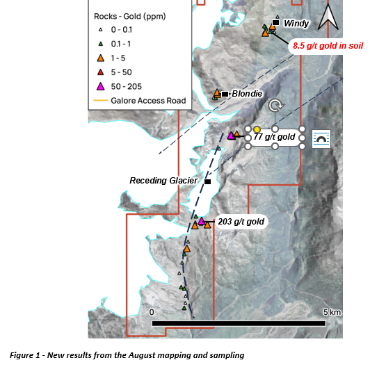 Gary Schellenberg stated, “Given the area over which we are finding gold and silver there is a remarkable amount of gold at surface on the property. We are confident that we are finally close to the bedrock source of these high-grade boulders and soil samples, coincident with prospective geophysical structures beneath the rapidly retreating glacier in the center of the property. This area will become the focus of work going forward.”