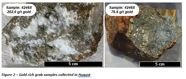 Of the 53 rock samples collected across the entire property, 35 contained greater than 0.1ppm gold, with 15 samples greater than 1 ppm gold.