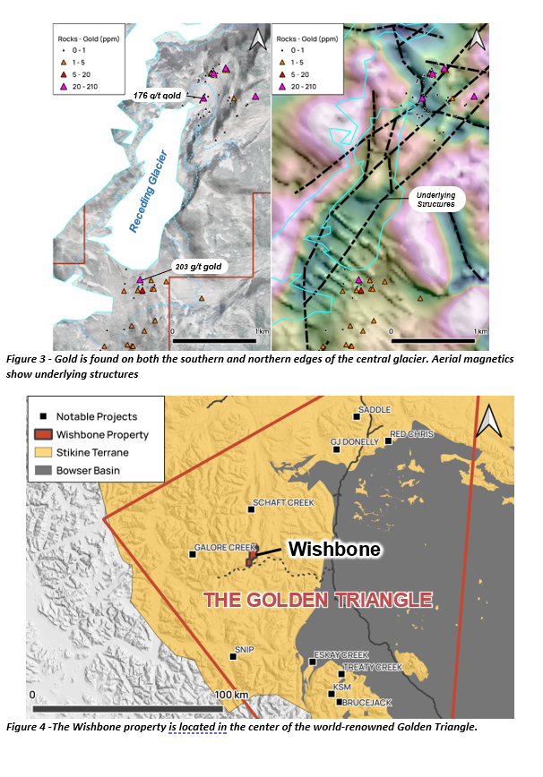 Vancouver, BC, November 23, 2023. Origen Resources Inc. (the “Company” or “Origen”) (CSE:ORGN; FSE:4VXA) Origen is pleased to announce results from the recent Wishbone Project site visit and sampling program completed by Dr. Thomas Hawkins and John Harrop. New high-grade gold samples were found at surface in glacial boulders on both edges of the rapidly-retreating central glacier.