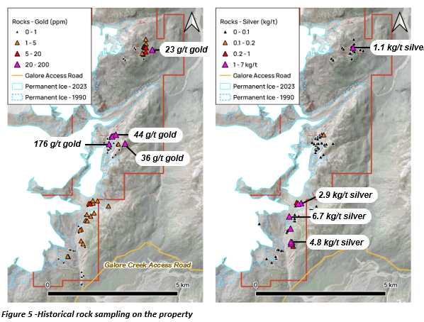 HIGHLIGHTS· Located in the centre of the Golden Triangle next to Schaft Creek and Galore Creek deposits.· Planned Galore Creek access road runs through the property.· Historical results of 6.7kg/t of silver and 202.6 g/t gold in grab samples.· Significant glacial retreat has exposed considerable new ground.· Re-processing and re-interpretation of Skytem geophysical data in progress.