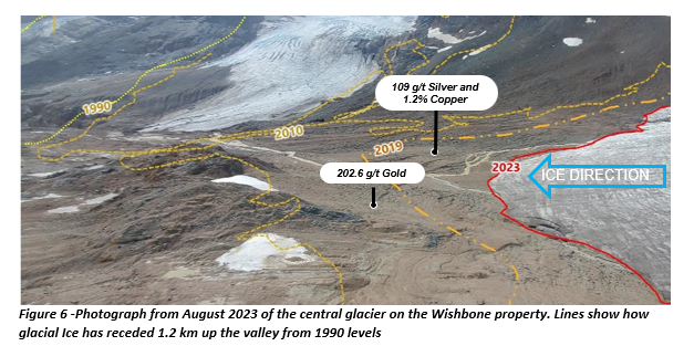 In September 2023, Origen’s Dr. Thomas Hawkins and John Harrop visited the Wishbone project. They were able to witness firsthand the rapid retreat of the central glacier and exposure of significant new ground. Gold and silver-rich float samples appear to be coming from a series of rapidly retreating glaciers in the centre of the property. A compilation of historical rock samples illustrates how prospective the ground is: rock samples of up to 6700g/t silver and 175.5g/t gold in samples of float have been taken at several targets over 10km.